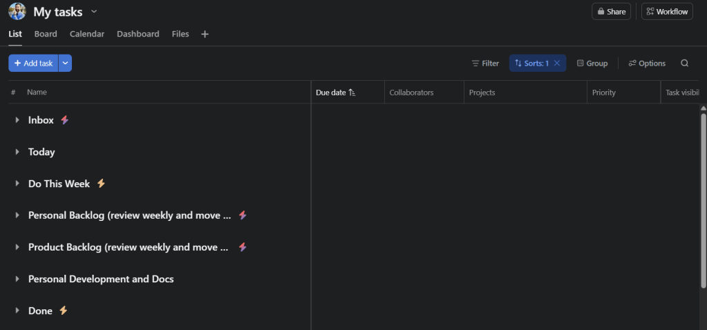 In general, each task tracker I used ended up with a personal project space. Some of them have a dedicated section like “My Tasks” in Asana, in others I’ve created it myself. It’s the purpose that matters, not the form. This personal project should be a space where you break your tasks into sections (both tasks that you’ve been assigned to and your personal notes like “Ping team X to merge our branches on March 1st”), prioritize them, set up automation rules.